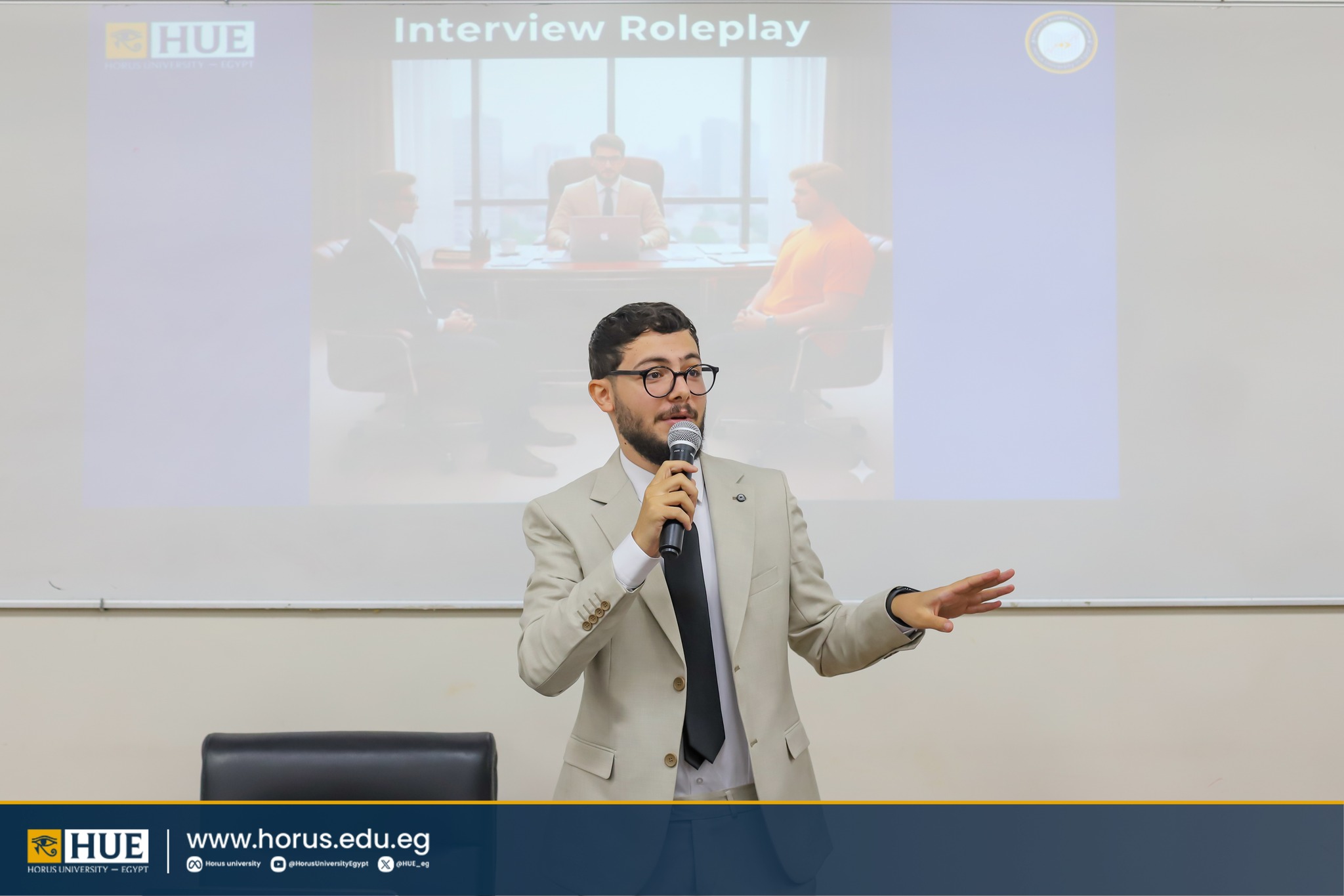 قدّم المهندس إبراهيم ناصف والخريجان حسين إيهاب وعبد الرحمن الأتربي نموذجًا عمليًا لمحاكاة المقابلات الشخصية.